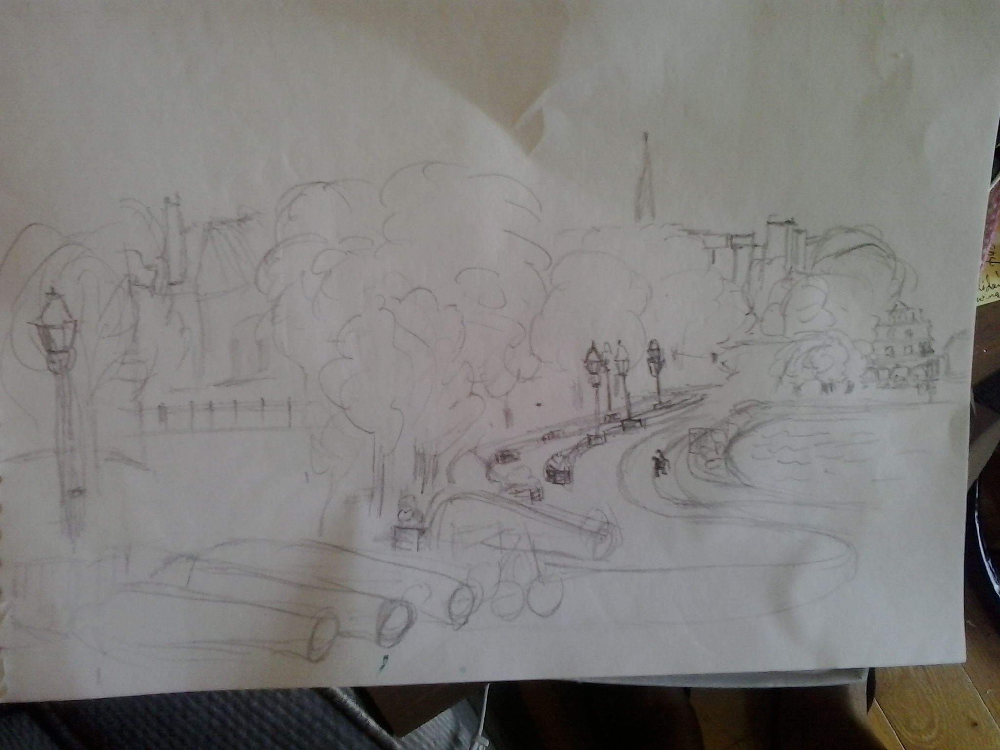 I made this rough sketch at the park before starting out. I was standing at the farther end of the enclosure of the Fort, so the view is more frontal than aerial, but when I did the painting, I shifted it so that the view would be more aerial.