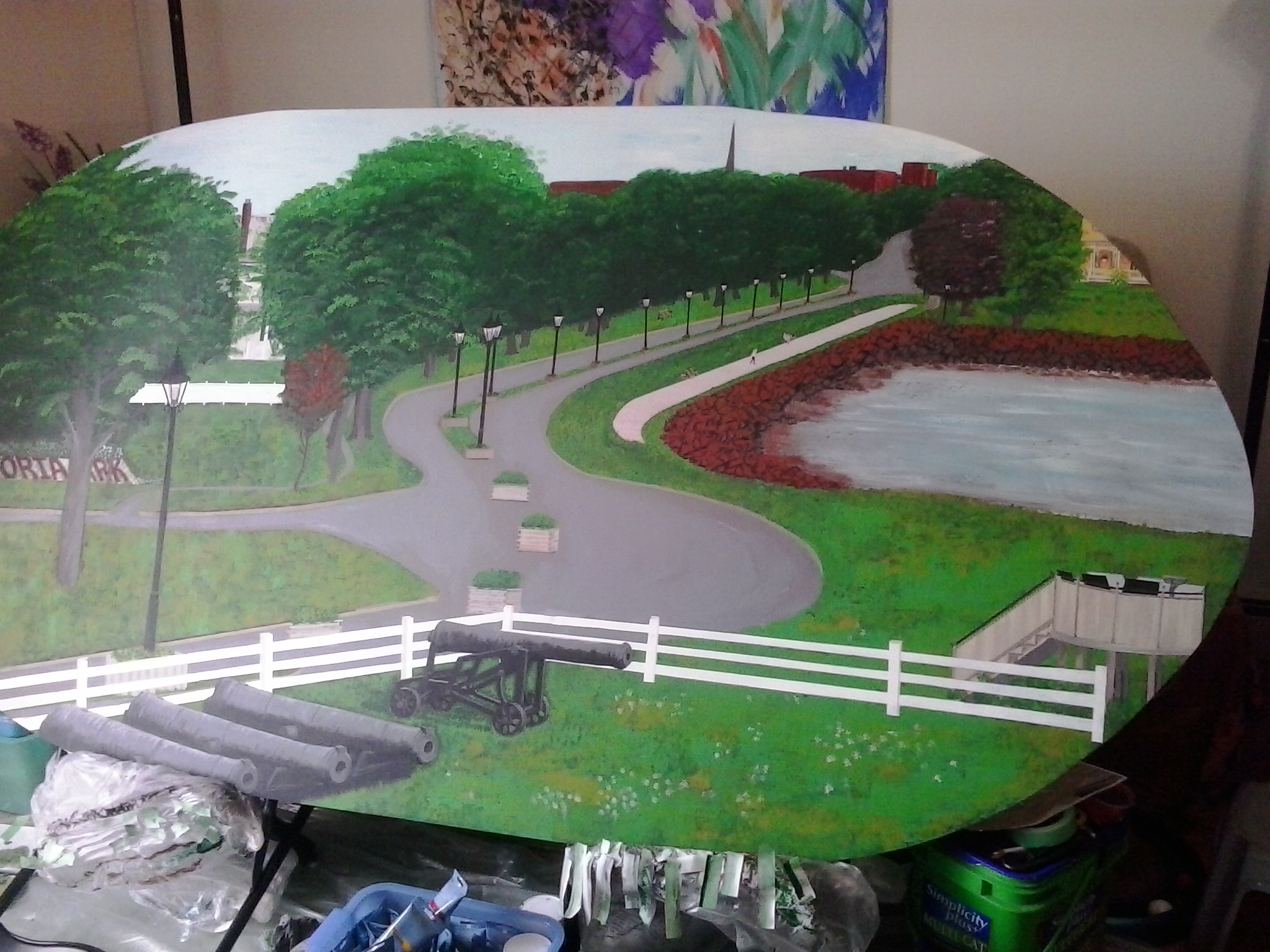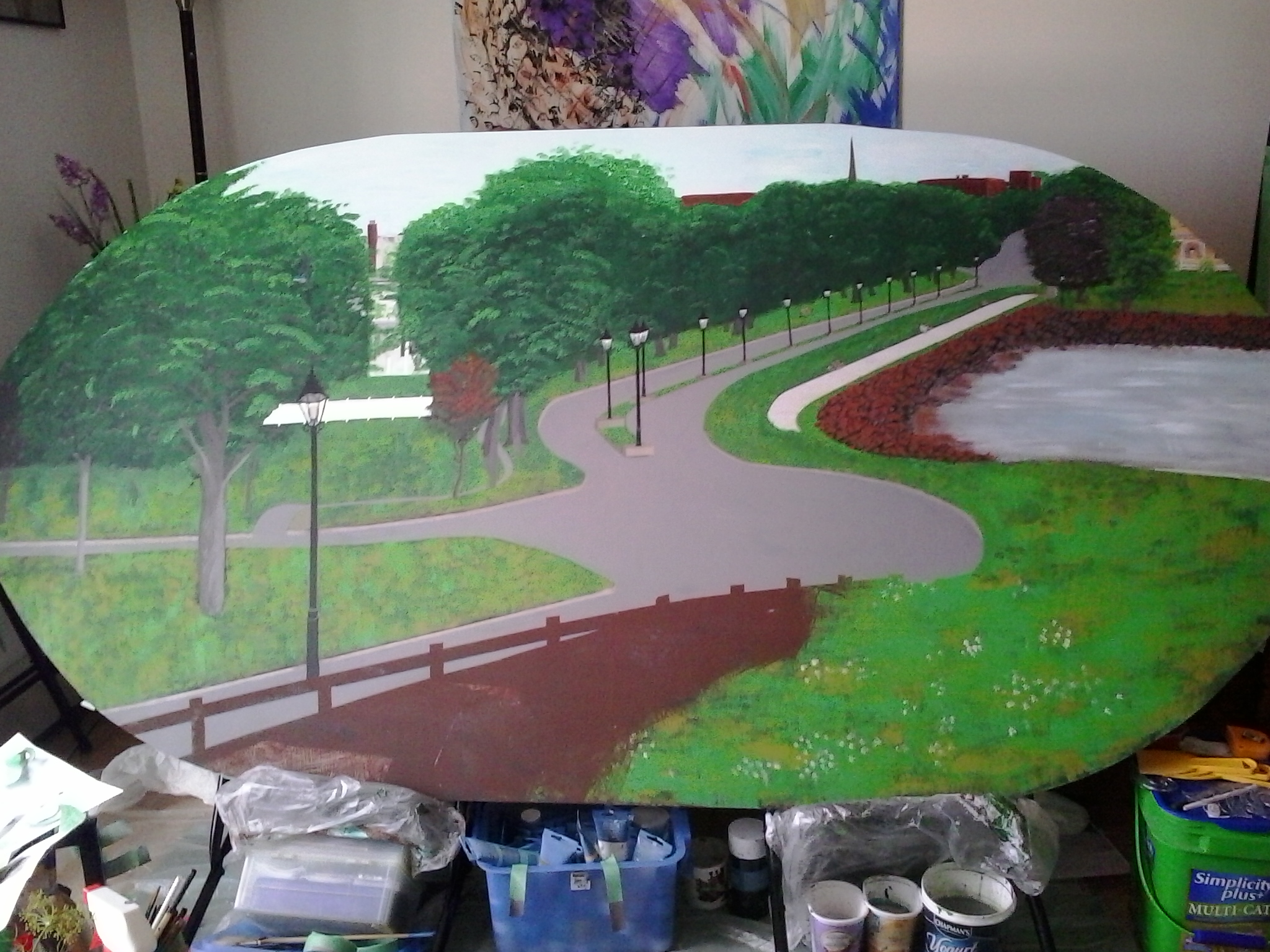 … and this is what it would look like if it were cropped into a perfect oval shape (which just didn’t happen when Peter was cutting it up with his jigsaw. If the clients want to trim the corners, that’s perfectly all right with me, but I deliberately made a wider ellipse to get as much painting surface as possible.