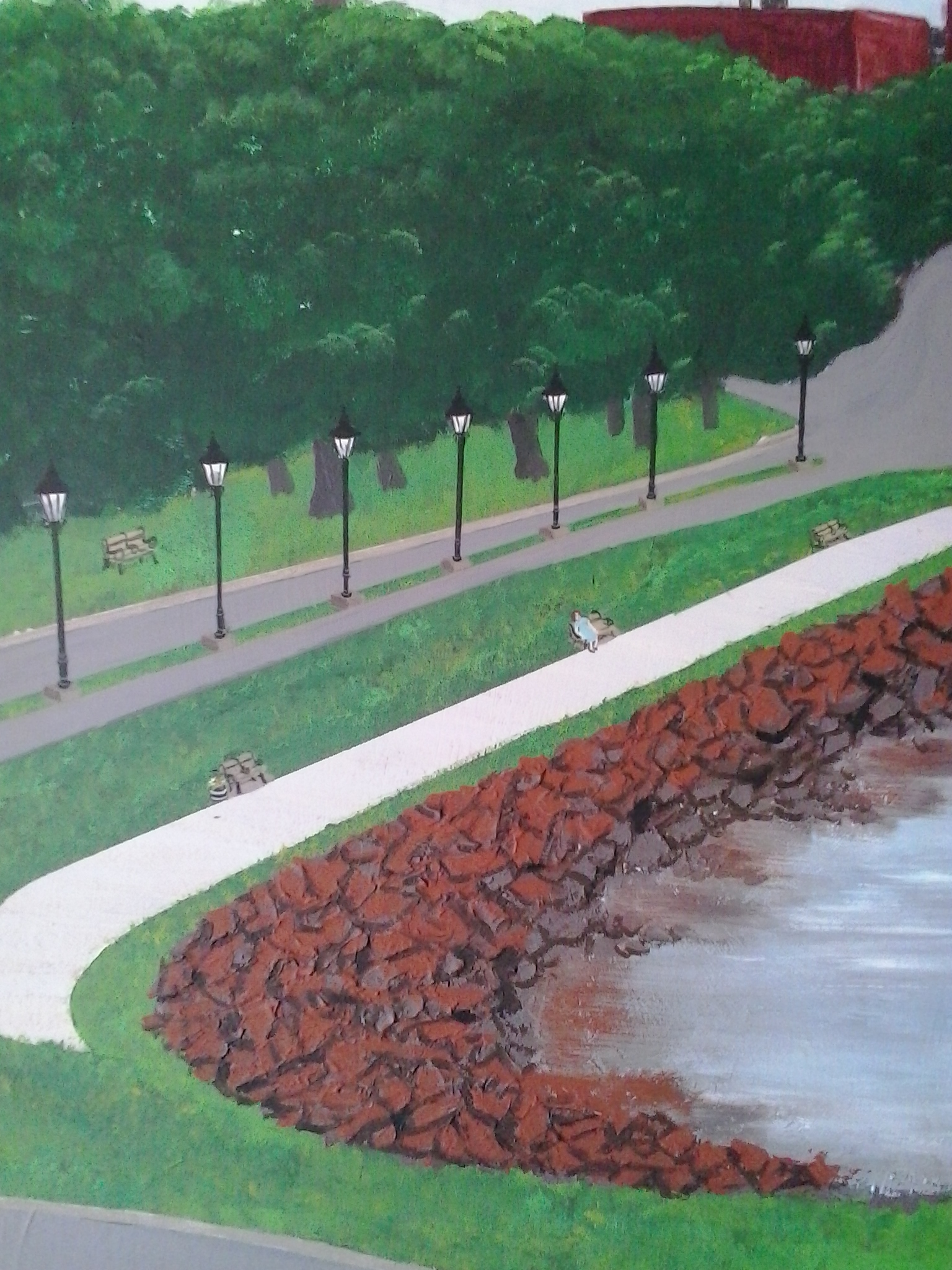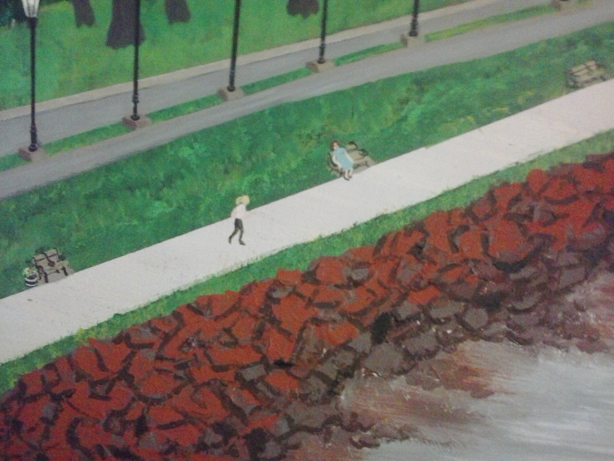 After the cannons, I added more details to the boardwalk–worked on the park benches and a seated woman. Then, when my friends Veronika and her daughter Viola were with me painting as well, I added a jogger so Viola would have her mom in the painting!
